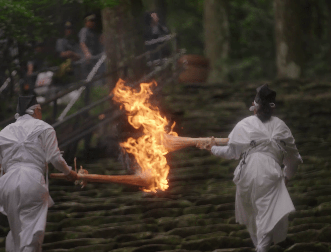 The blazing torches illuminate the stone steps, creating a mystical and sacred atmosphere. As one of the central events of Kumano faith—a belief system that has drawn pilgrims to this sacred site for centuries—the ōgi matsuri strongly reflects elements of nature worship, including reverence for the sun, water, and fire.