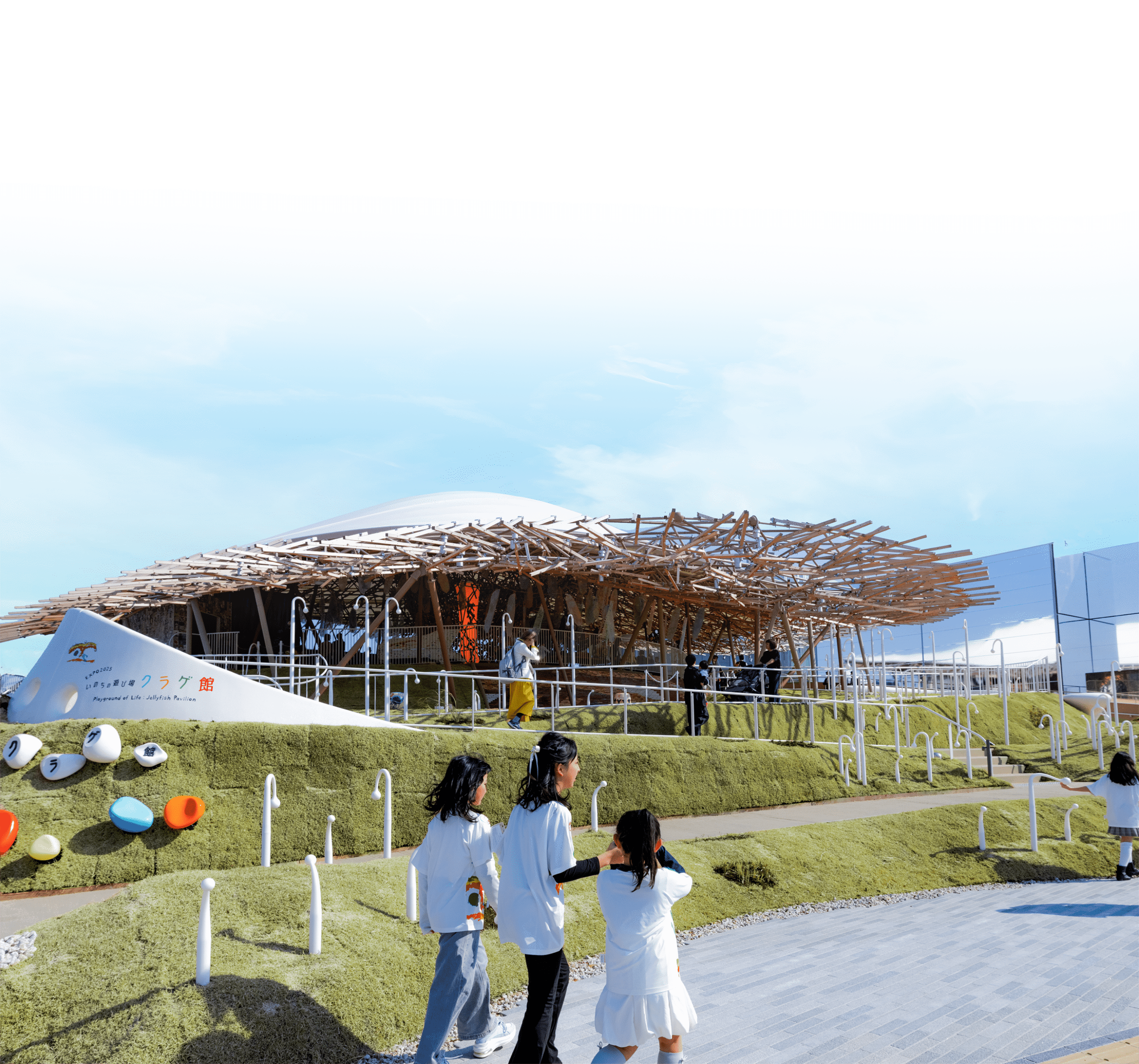 「創造の木」は、「プレイマウンテン」を登った丘の上にひろがる「いのちのゆらぎ場」の中央にそびえる、万人万物のいのちの創造性を象徴する木です。4,600本ほどの吉野杉からできた角材が、丁寧解体ができるように組み合わされ、粘菌アルゴリズムによって複雑にゆらぎのクラゲ膜の形を作っています。