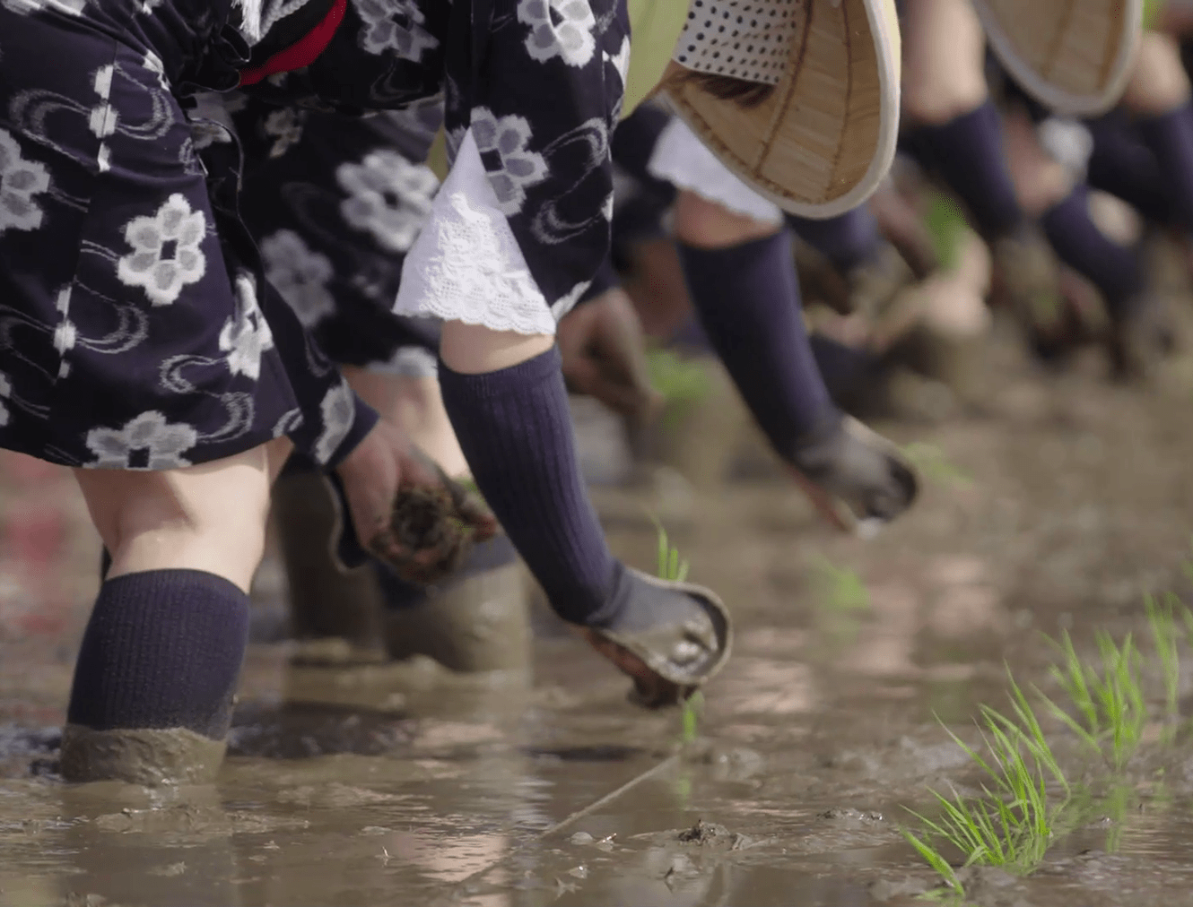 "毎年6月の第一日曜日、美しい鞍をつけた飾り牛や、菅笠を被った早乙女(さおとめ)らおよそ100名で行われる田園絵巻。田の神である三拝(サンバイ)を祀って、その年の稲作の無事と豊作を祈願する行事。太鼓や笛の囃子方(はやしかた)が奏でるリズムに合わせて、色鮮やかな花笠や絣模様の着物をまとった早乙女と呼ばれる女性たちが、囃子歌と共に苗を植えていく。また、竹を割って作った「ササラ」をもって音頭を取り、田植を指揮する人はサンバイと呼ばれ、田の神の役割を担う。造花や金色の鞍で飾られた「飾り牛」が代掻きを行い、囃子方が時折バチを投げ上げたりしながら、太鼓を打ち鳴らす様子は迫力がある。 ユネスコ無形文化遺産 国指定重要無形民俗文化財"